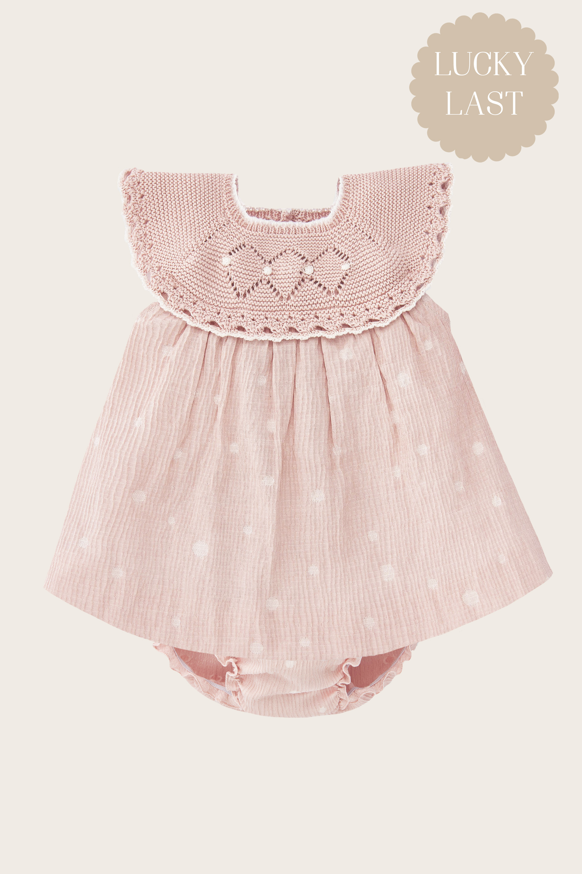Gorgeous Pink Dress and Bloomer set for baby girls by Paz Rodriguez. The neckline of the Dress is designed a soft cotton knit with intricate diamond lace detailing and white piping on the trim. The skirt and bloomer is a pink crinkled effect fabric with a white polka dot effect.