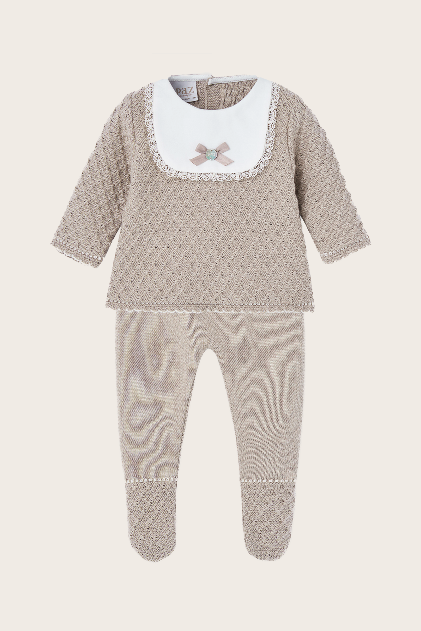 A beautifully knitted set for baby girls by Paz Rodriguez, made in Spain from a soft blend of 95% cotton and 5% cashmere. The taupe brown long sleeve top is crafted in a delicate diamond knit pattern, with a smart white bib collar trimmed in lace and finished with a grosgrain bow and mother-of-pearl charm. It paired with matching footed trousers, designed with coordinating textured knit on the feet for a refined touch. Both comfortable and elegant, this set is perfect for everyday luxury or special occasions.