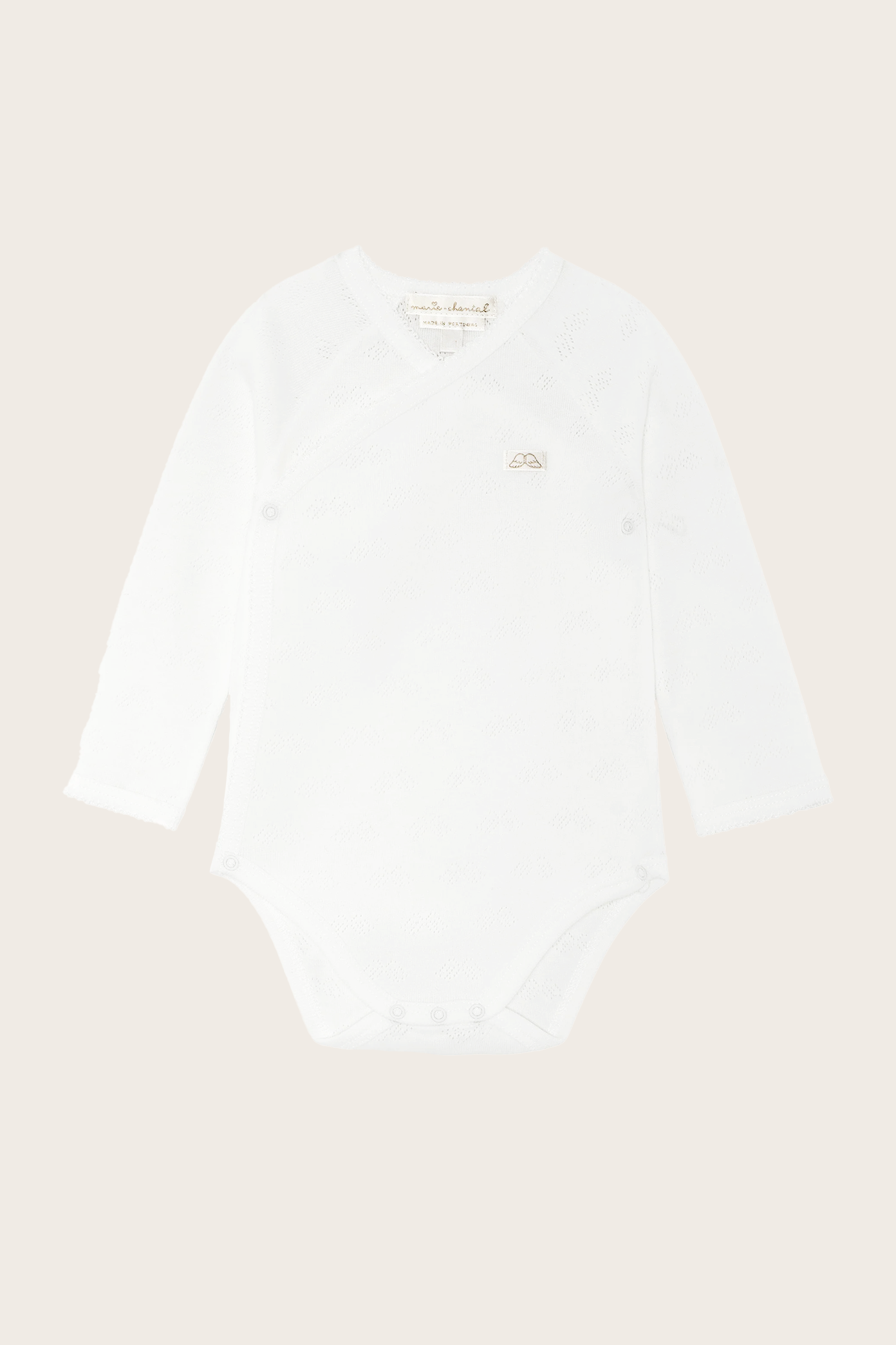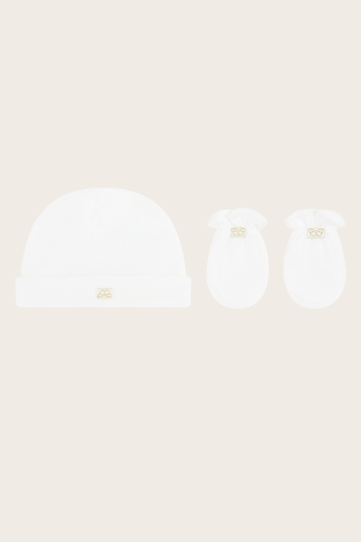 Made from 100% cotton and featuring Marie-Chantal’s signature Angel Wing pointelle design, this newborn set includes a matching onesie, hat, and mittens – an essential ensemble for your little one’s first wardrobe. Each piece is finished with delicate white picot trim and adorned with the brand’s iconic gold Angel Wing for a touch of timeless charm. Designed for comfort and practicality, the onesie includes snap fastenings for easy changing, while the coordinating hat and mittens keep baby snug and stylish.