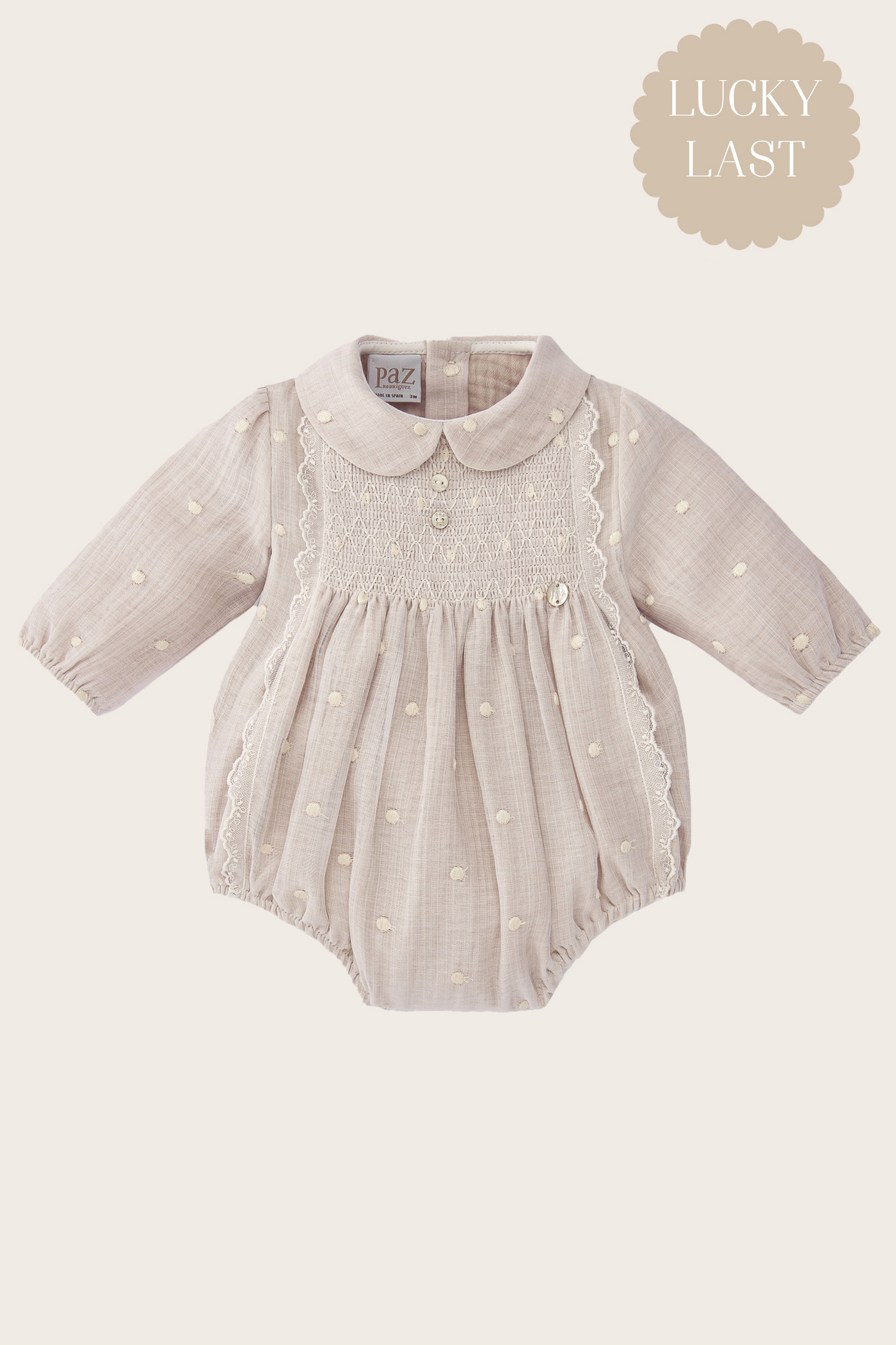 Timeless and effortlessly charming, our Beige Polka Dot Lace Bubble by Paz Rodriguez is a perfect addition to your little girls wardrobe. Crafted from soft, breathable cotton fabric, it features delicate organza polka dot layer, lace trimming and elasticated leg openings for all-day comfort. A classic silhouette, ideal for both special occasions and everyday elegance.